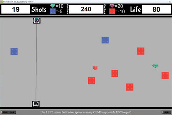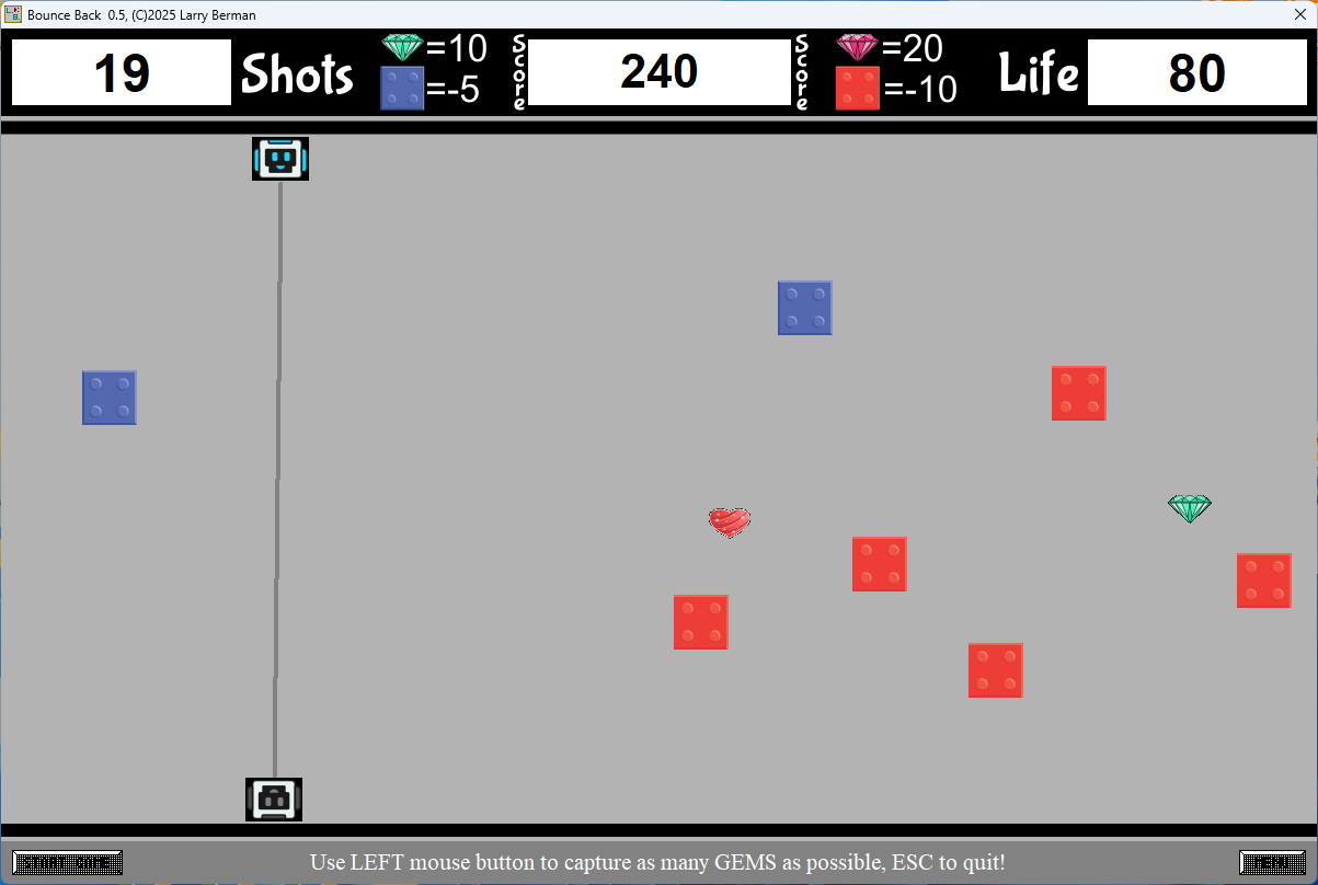 Game play is fairly simple however not easy. Once the game begins a shooter robot will appear randomly on the bottom of the screen and the catcher robot will randomly appear on the top of the screen which will shift responsibilities after each shot. Throughout the game diamonds will randomly appear on the screen which need to be caught for points. RED & BLUE blocks will reduce life % when hit while PINK HEARTS will replenish life %. High score saving, great music & sounds accompany this game.