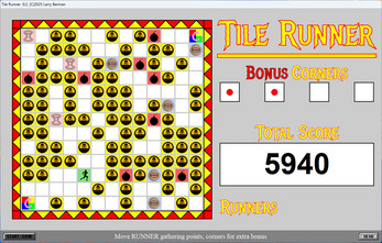 Game play is fairly simple however not easy. Once the game begins the Tile RUNNER will appear in the center of the 13 x 13 play grid. You will need to move the Runner 1 space either horizontally or vertically but NOT diagonally for each move. Also, each move 1-3 new DANGER tiles will randomly appear on the board which if stepped on will kill the RUNNER. In addition to the DANGER tiles each of the following function tiles will appear 20% of the time. TELEPORTATION, BONUS, & CLEAR. The game will end once all 5 RUNNERS have been killed. High score saving & great music & sounds.